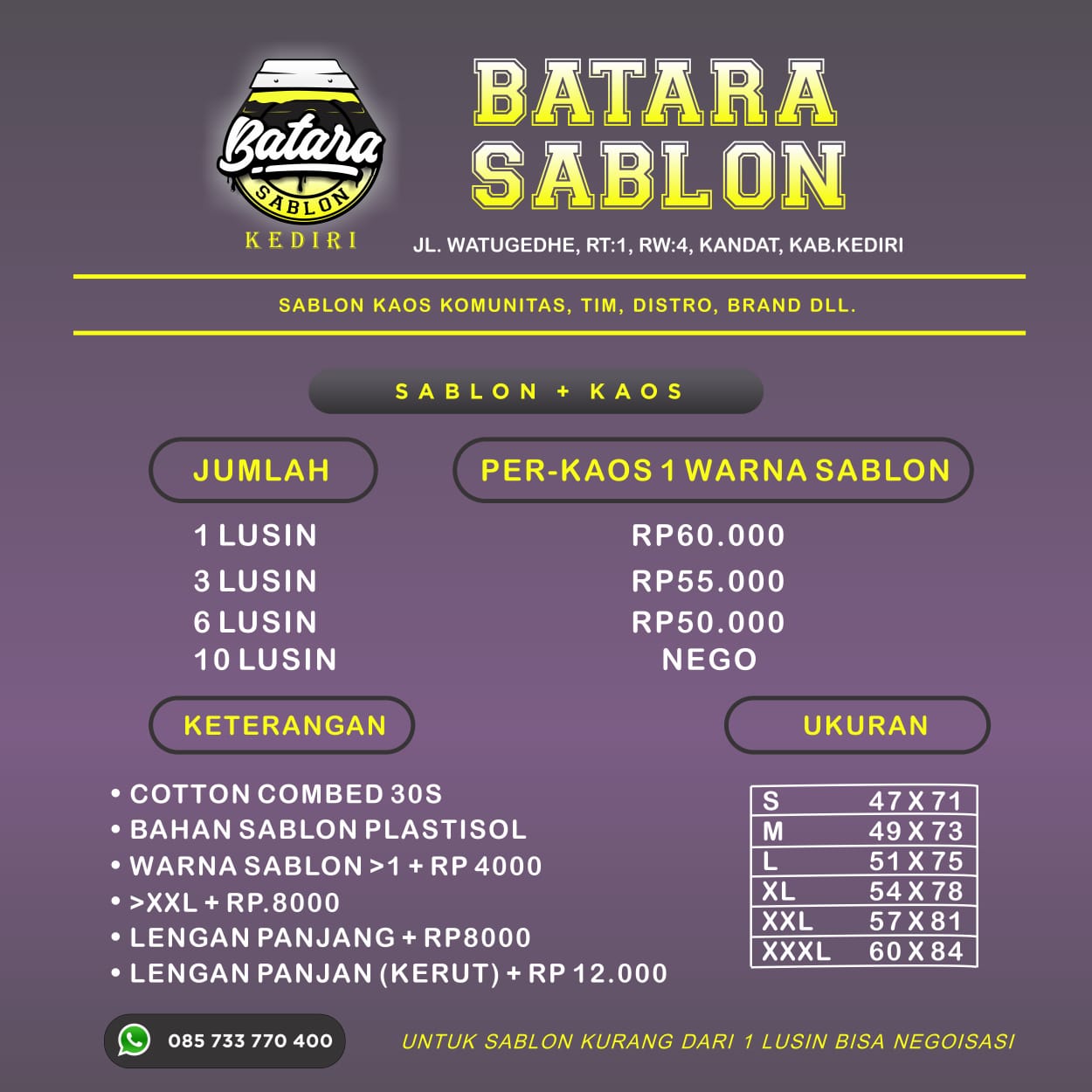 BATARA SABLON adalah usaha di bidang percetakan yang berfokus pada kaos, merchandise, dan desain grafis. Beralamatkan di Jl. WatuGedhe Rt.01/Rw.IV, Kandat Kabupaten, Kediri. Bisnis percetakan ini mulai beroperasi sejak 2018 lalu. Walau masih tergolong baru, Batara Sablon sudah berhasil membangun koneksi hingga luar Karisidenan Kediri. Salah satu brand distro terkenal di Banyuwangi juga sudah bekerja sama dengan Owner Batara Sablon ini.